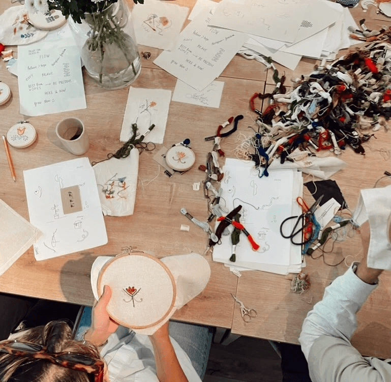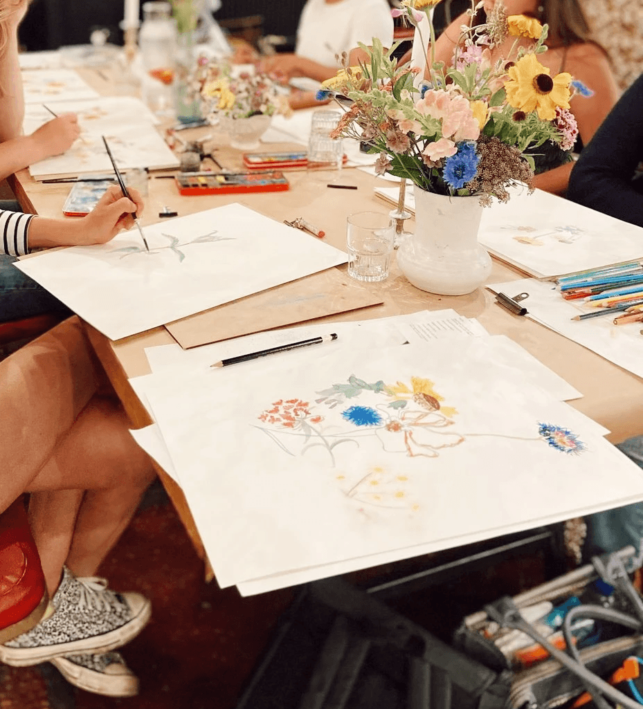 Every season we gather to try different creative practices: you might find yourself shaping clay, stitching thread, mixing watercolor, carving prints, or binding a handmade notebook. A space to step away from the noise of everyday life and reconnect with yourself, your hands, and the people around the table.